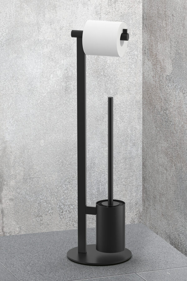 Zestaw szczotka toaletowa z uchwytem na papier toaletowy. Wygodny demontaż pojemnika w celu łatwego utrzymania w czystości. Wewnątrz pojemnika plastikowy ociekacz. Gumowe nóżki zapobiegają rysowaniu podłogi. Wymienna plastikowa końcówka szczotki. Stal nierdzewna malowana proszkowo na czarno.